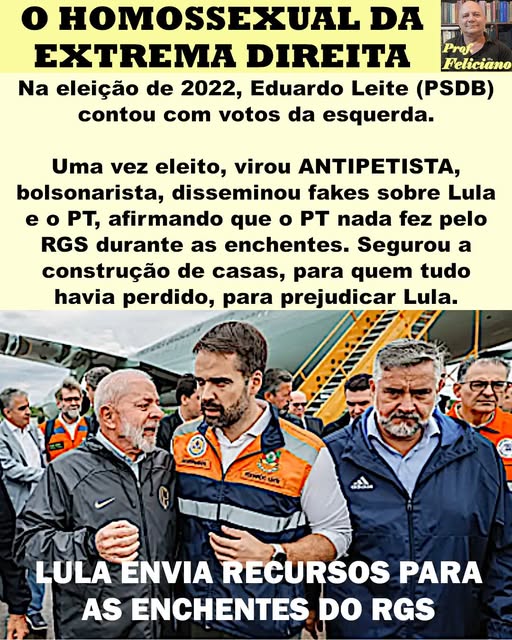 Na enchente, CRIAVA FAKE NEWS SOBRE INAÇÃO DO GOVERNO LULA. Não tratou das comportas de Porto Alegre, que ocasionou o deslocamento de pessoas carentes de suas casas. Quando Lula enviou o exército para auxiliar, negou a iniciativa de Lula. Espalhou notícias falsas sobre a falta de recursos federais. Quando Lula enviou recursos para a reconstrução de casas, Leite prendeu os recursos para não entregar aos atingidos pela cheia.