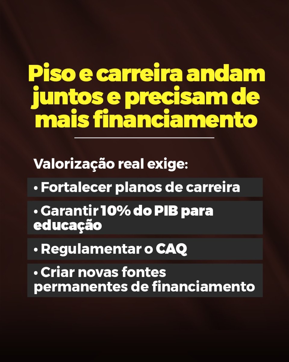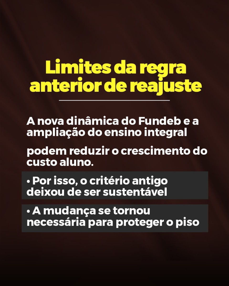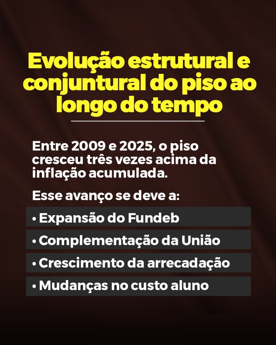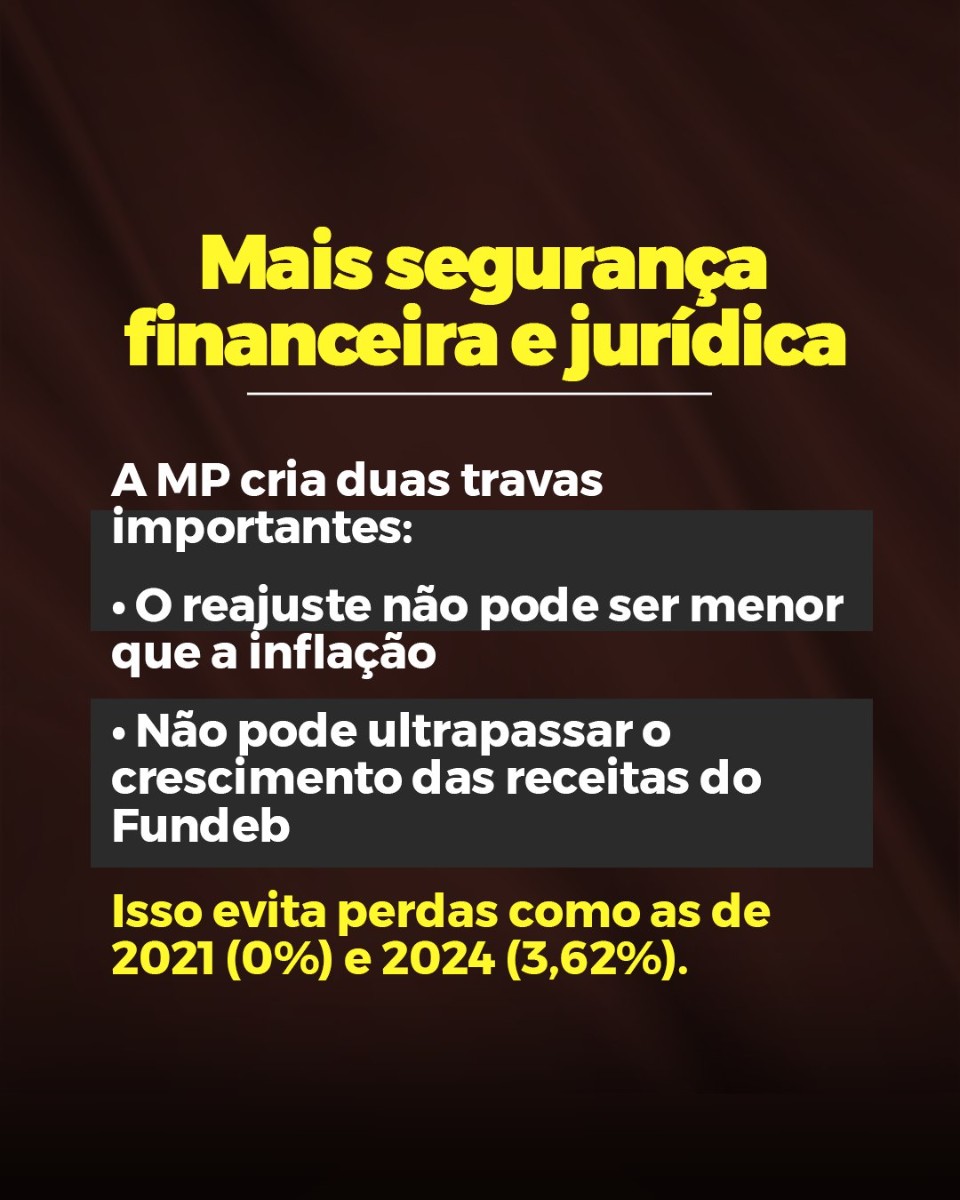 Ao assegurar que o reajuste anual do Piso não fique abaixo da inflação medida pelo INPC e incorpore parte do crescimento das receitas do Fundeb, a nova regra rompe com a lógica do arrocho salarial e estabelece ganho real permanente. O Piso passa a ser de R$ 5.130,63 para a jornada de até 40 horas semanais, consolidando um avanço na política de valorização da educação pública.