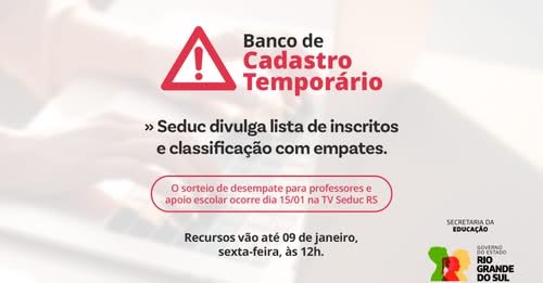 Os sorteios serão transmitidos ao vivo pelo Canal TV Seduc RS, na plataforma YouTube, garantindo transparência ao processo. A homologação final da classificação está prevista para o dia 23 de janeiro de 2026. O Banco de Cadastro Temporário terá validade de dois anos, contados a partir da data da publicação final.