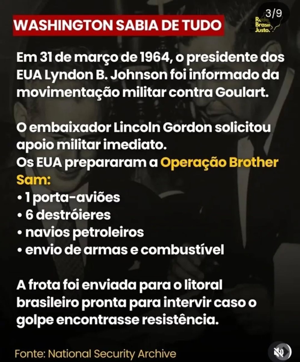 Quando a movimentação militar começou, Washington já estava preparado para apoiar os golpistas. A chamada Operação Brother Sam mobilizou navios de guerra, petroleiros e apoio logístico na costa brasileira, prontos para intervir caso houvesse resistência. O então presidente dos EUA, Lyndon B. Johnson, acompanhou o processo em tempo real.
