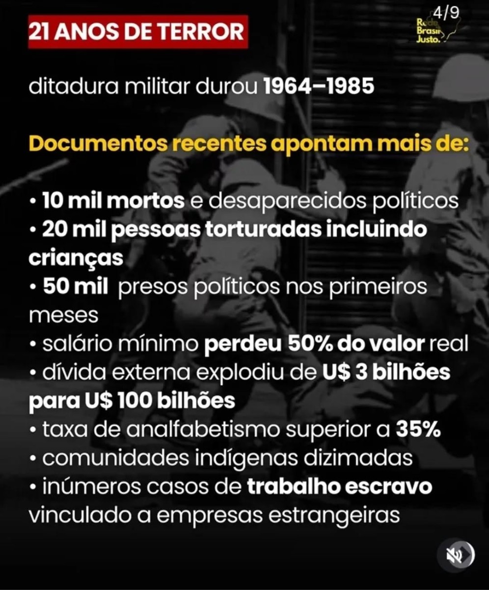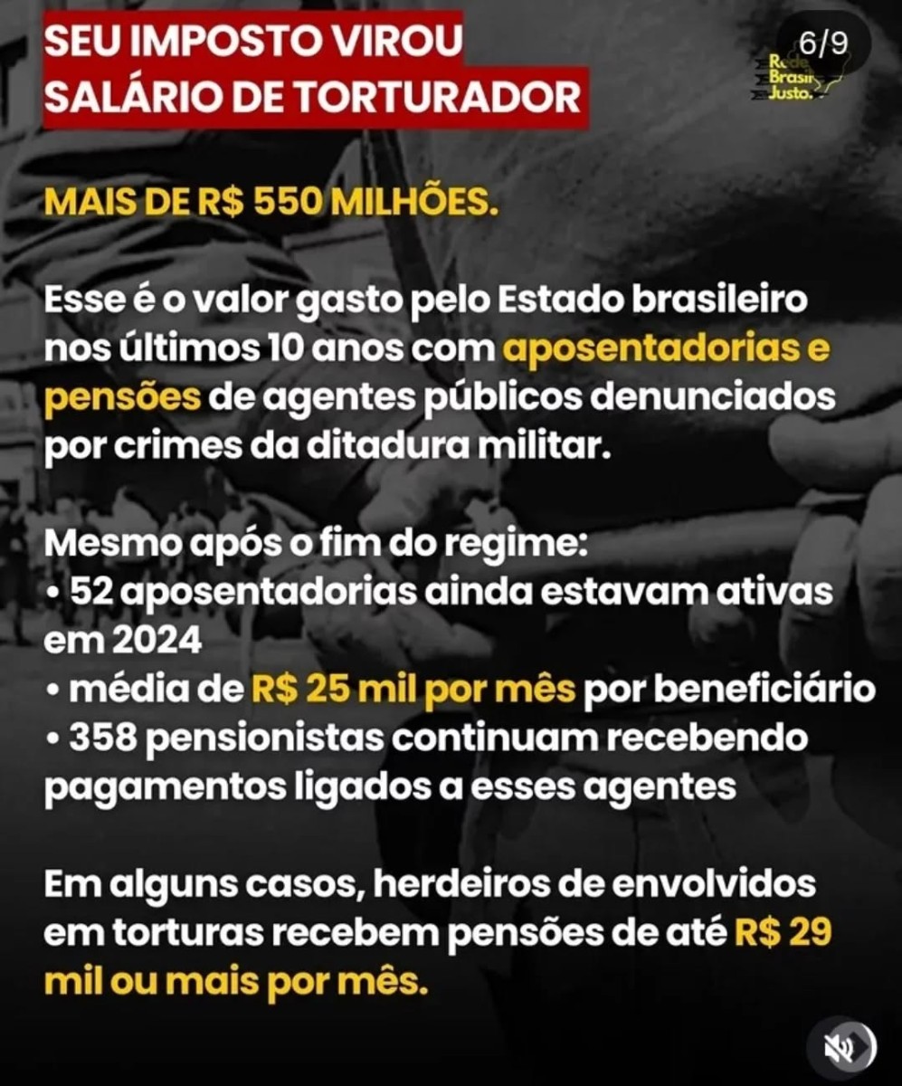 Mesmo décadas depois do fim da ditadura, as consequências ainda permanecem. Levantamentos apontam que o Estado brasileiro continuou pagando centenas de milhões de reais em aposentadorias e pensões ligadas a agentes do regime, enquanto familiares de vítimas ainda lutam por memória, verdade e justiça.