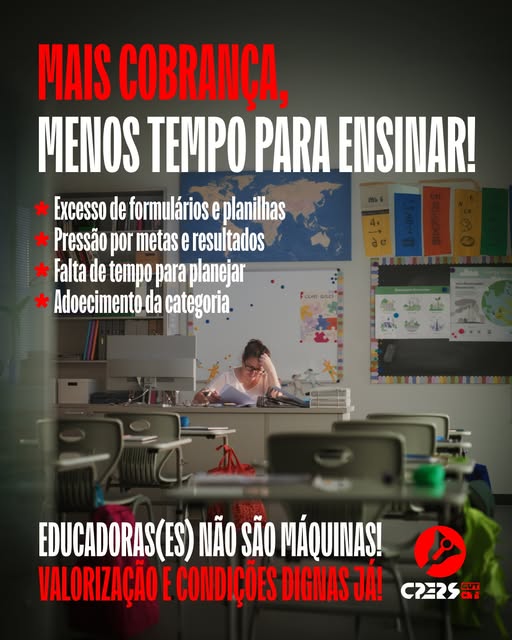 Mais cobrança, menos tempo para ensinar! A volta às aulas no Rio Grande do Sul escancara uma realidade que a categoria já conhece bem: a sobrecarga de trabalho só aumenta. São planilhas, formulários, relatórios, metas, cobranças e pressões constantes. Enquanto isso, faltam condições dignas, valorização profissional e respeito ao tempo pedagógico.