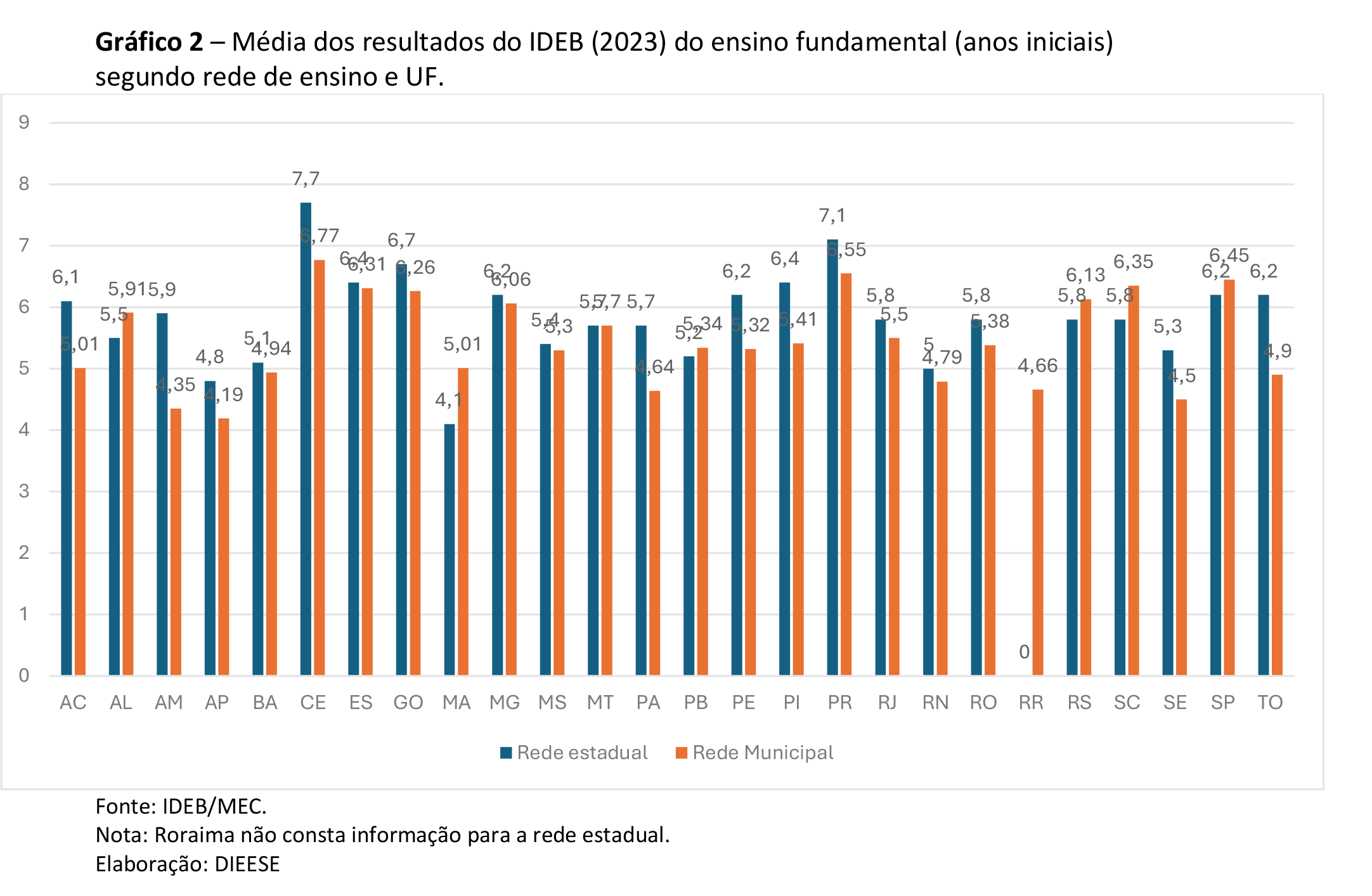 O estudo do Departamento compara o desempenho no Índice de Desenvolvimento da Educação Básica (IDEB) entre redes estaduais e municipais em diferentes estados do Brasil. Os dados demonstram que, na maioria das unidades da federação, a rede estadual apresenta resultados iguais ou superiores aos da rede municipal — desmontando o argumento de que a municipalização, por si só, representa melhoria na qualidade do ensino.