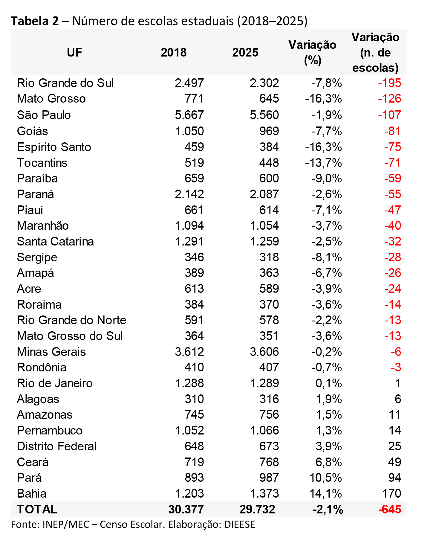 Esse movimento se torna ainda mais evidente ao se observar o fechamento de escolas. Entre 2018 e 2025, o Rio Grande do Sul encerrou as atividades de 195 escolas estaduais, colocando o estado no topo desse ranking, à frente inclusive de unidades da federação como Mato Grosso e São Paulo.