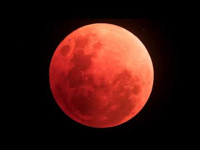 | A lua cheia em eclipse se dirigindo para a lua de sangue. |