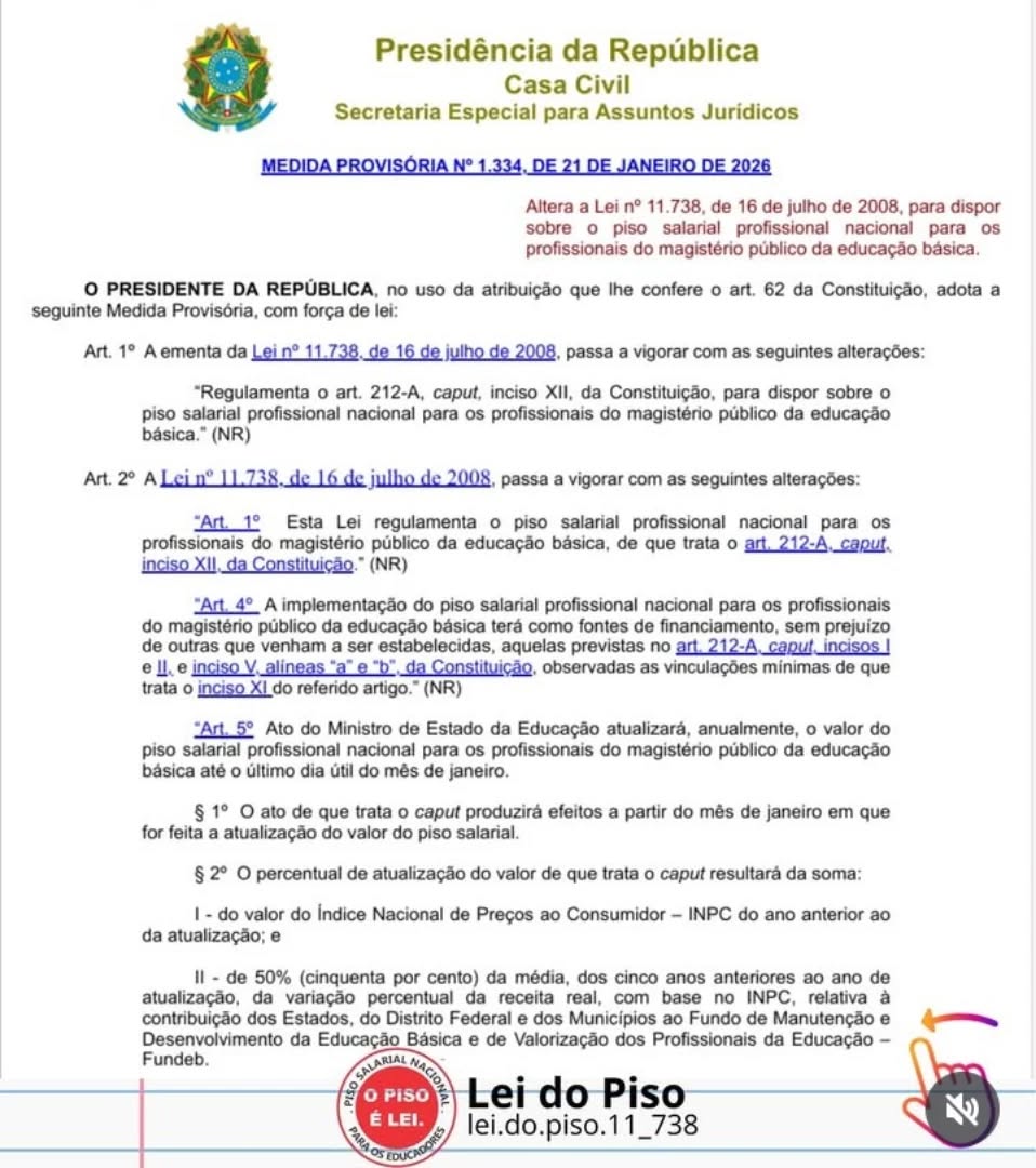 - Atualmente, o piso dos professores está em R$ 4.867,77, após aumento de 6,27% em 2025. Pela regra atual, o reajuste em 2026 seria de apenas 0,37%, acréscimo de R$ 18 no valor mensal. Ou seja, o piso passaria a ser R$ 4.885,78.