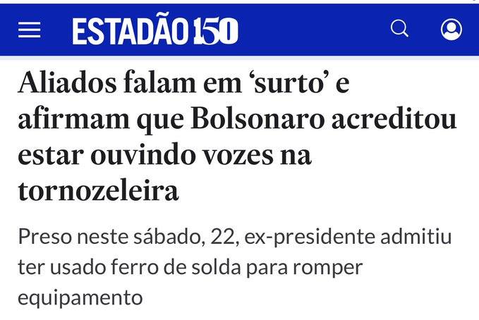 " Bolsonaro derreteu a tornozeleira e seus aliados querem derreter a inteligência do país junto. Primeiro, disseram que era apenas defeito. Daí, aparece um vídeo dele explicando como queimou o aparelho. Depois, que ele estava grogue quando afirmou que queimou o aparelho, mas o próprio Jair diz que havia feito a arte na tarde do dia anterior.