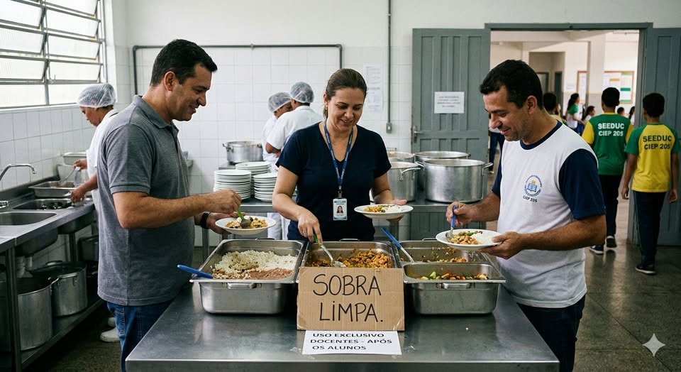 * Os professores só podem comer se houver **"sobra limpa"** (alimento que foi preparado, mas não foi servido aos alunos).