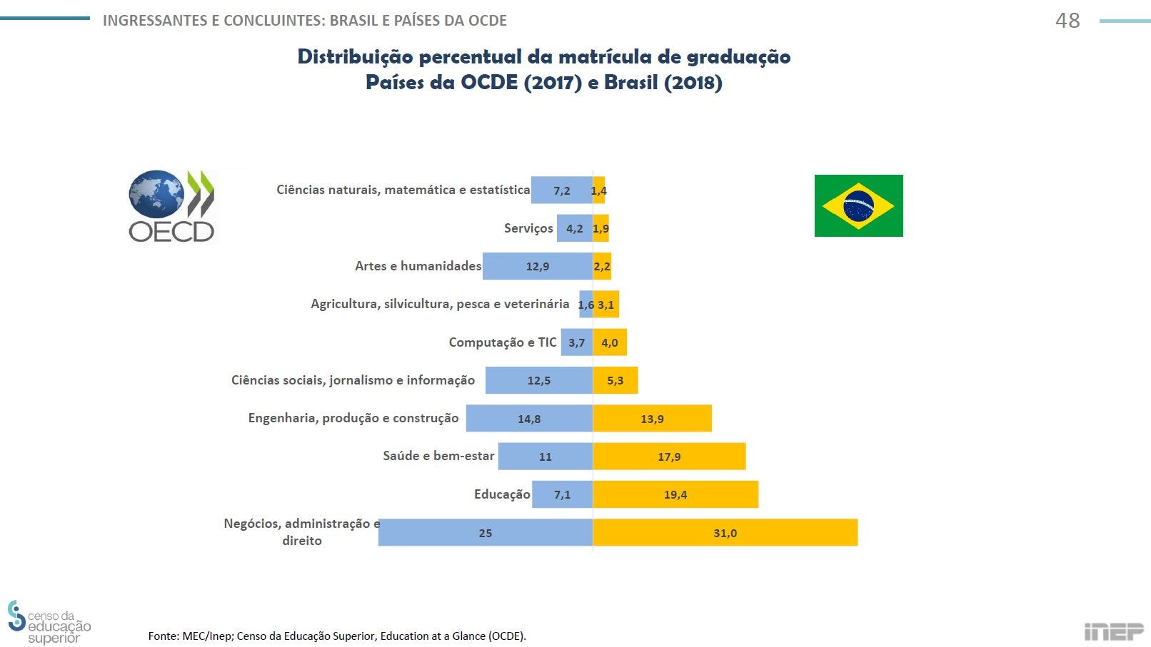 Quando olhamos para o número de matrículas por áreas do conhecimento, notamos que as humanidades e as ciências sociais (que o ministro argumenta que teriam sido prioridade) estão abaixo da média da OCDE no BR. Diferente da área da saúde e bem estar e de engenharias, por exemplo, veja na imagem abaixo.