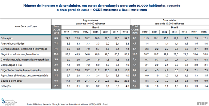 Até aqui analisei apenas para os cursos citados pelo ministro como aqueles que teriam sido priorizado, mas se falarmos em relação a área de conhecimento, “saúde e bem-estar” foi a das que mais expandiu vagas e tem ingressantes e concluintes no Brasil acima da média da OCDE.