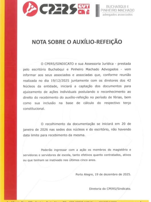 Atenção, sócias(os)! O CPERS, junto com sua assessoria jurídica, segue firme na defesa dos direitos das(os) educadoras(es). Agora, a luta é pelo pagamento do auxílio-refeição durante as férias e sua inclusão na base de cálculo, um direito que vem sendo negado pelo governo Eduardo Leite (PSD).